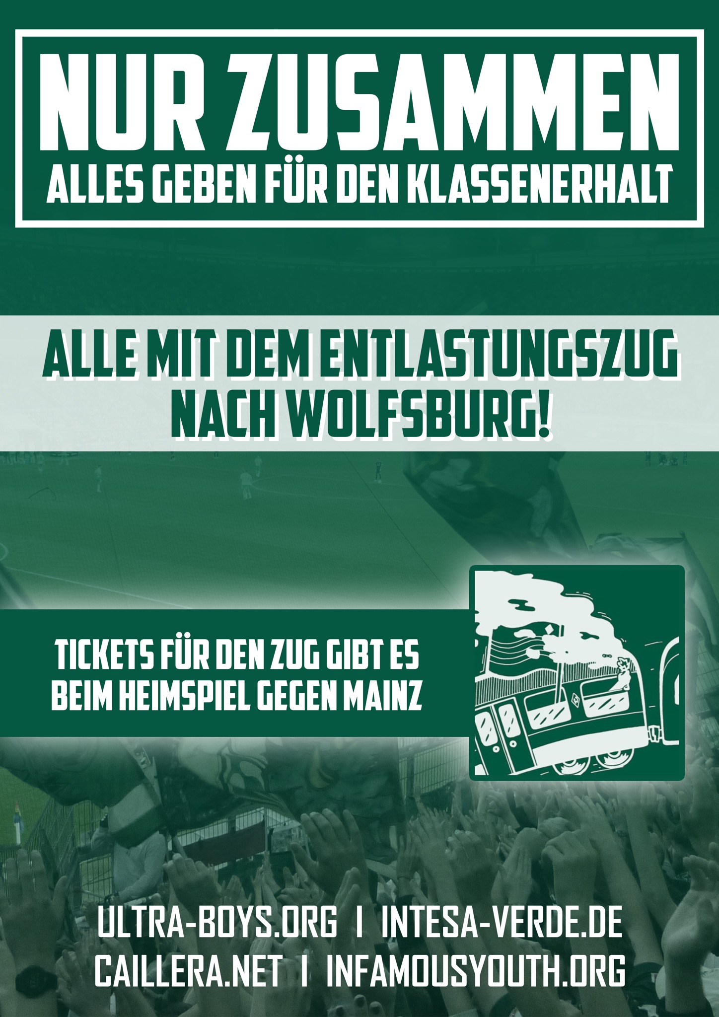 Zum Auswärtsspiel in Wolfsburg wird es einen Entlastungszug geben. Dieser kostet 15€ pro Person. Das Zugticket gilt für die Hin- und Rückfahrt.